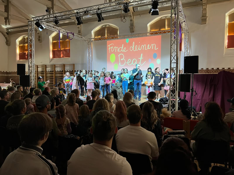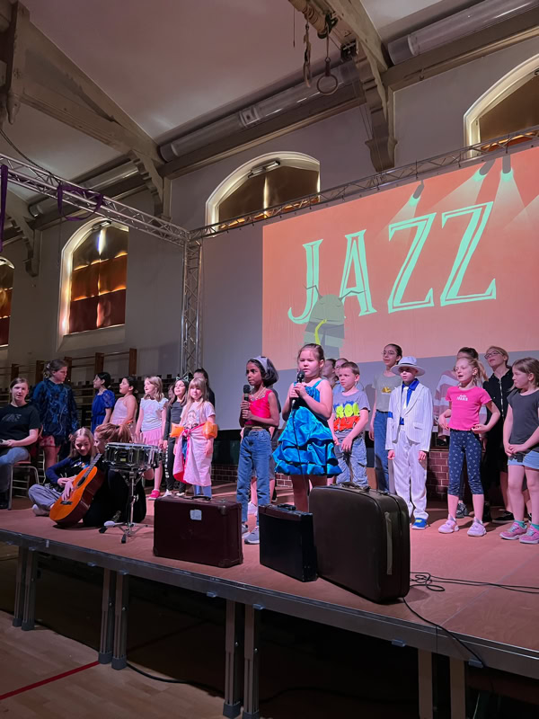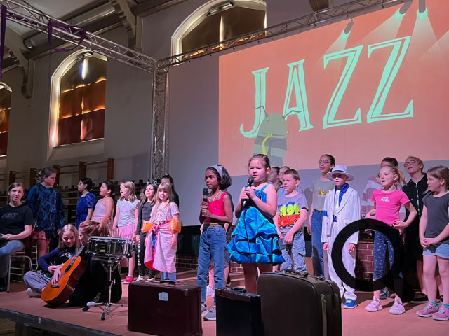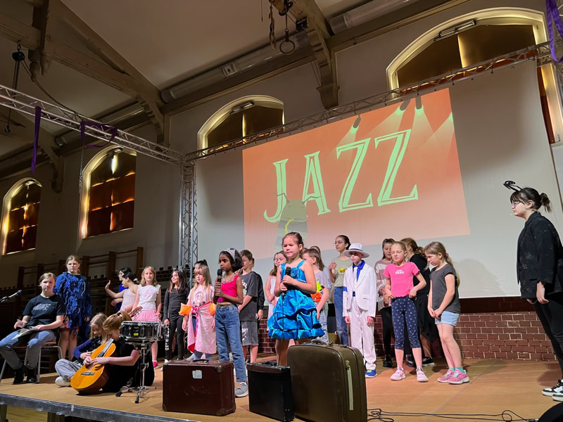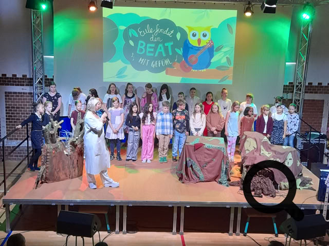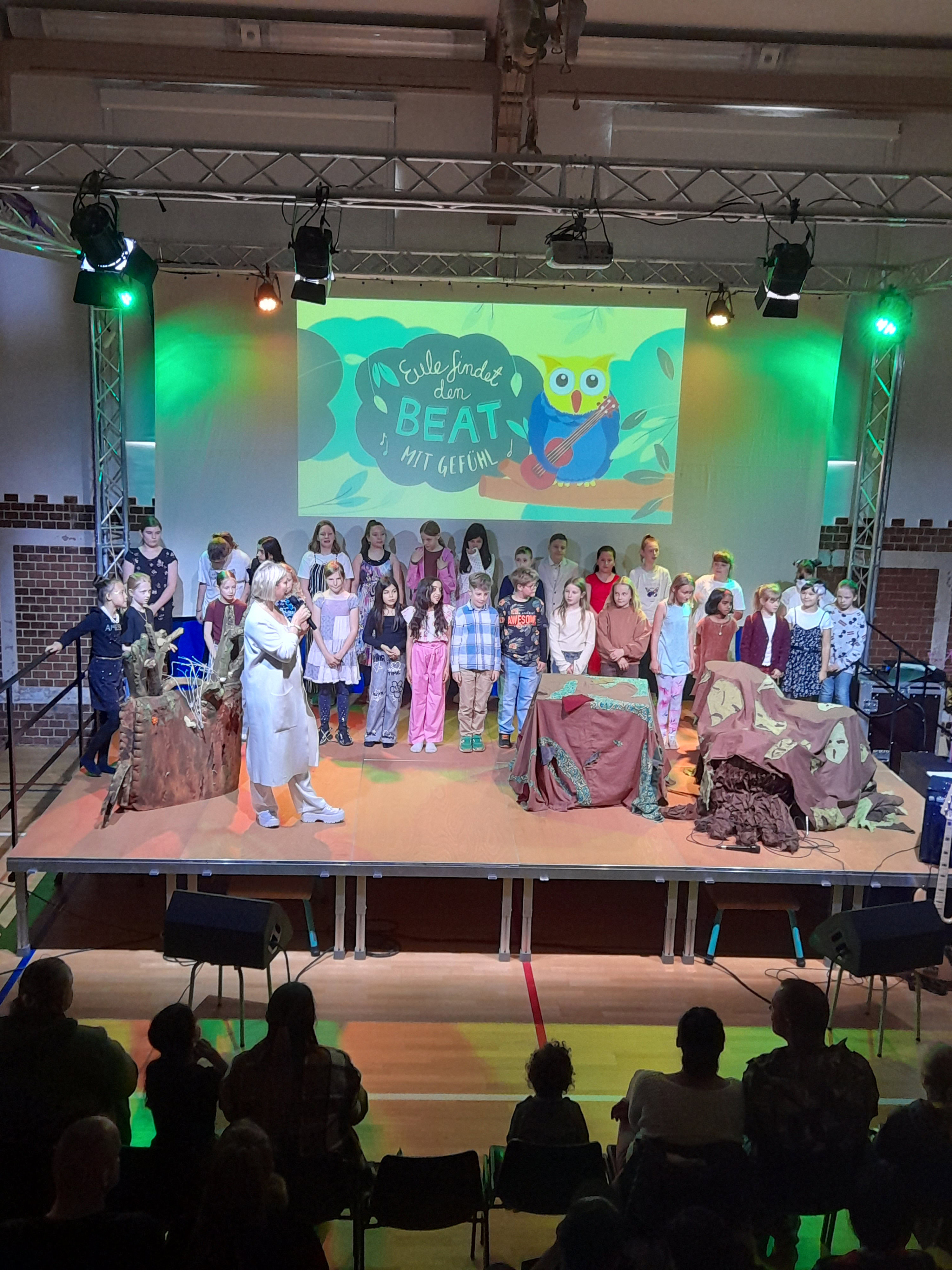 Gleich acht verschiedene Musikrichtungen hatten die Schülerinnen und Schüler für ihre Gäste im Gepäck und sie hatten sichtlich Spaß an dem was sie in den vorangegangenen Monaten einstudiert und geprobt hatten. Gleich zwei Aufführungen standen auf dem Programm. Am Samstag, den 4.Mai 2024 konnten sich die Eltern, Verwandten und andere Gäste gemeinsam mit Eule auf eine Reise durch die verschiedensten Genres mitnehmen lassen. Das selbe Vergnügen hatten dann am Montag, den 6.Mai 2024 auch alle Schülerinnen und Schüler der Friedensgrundschule.