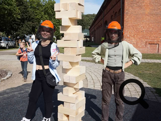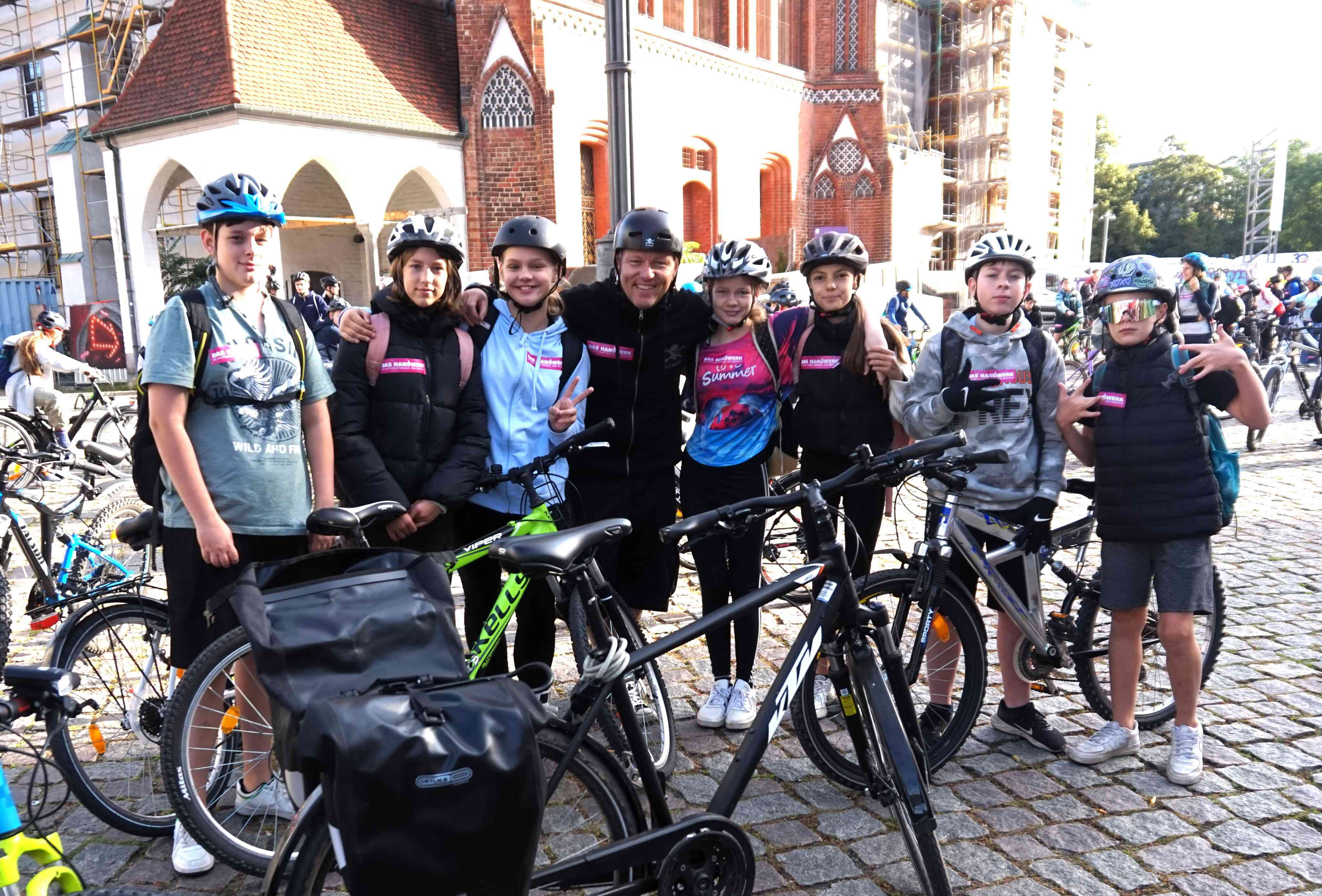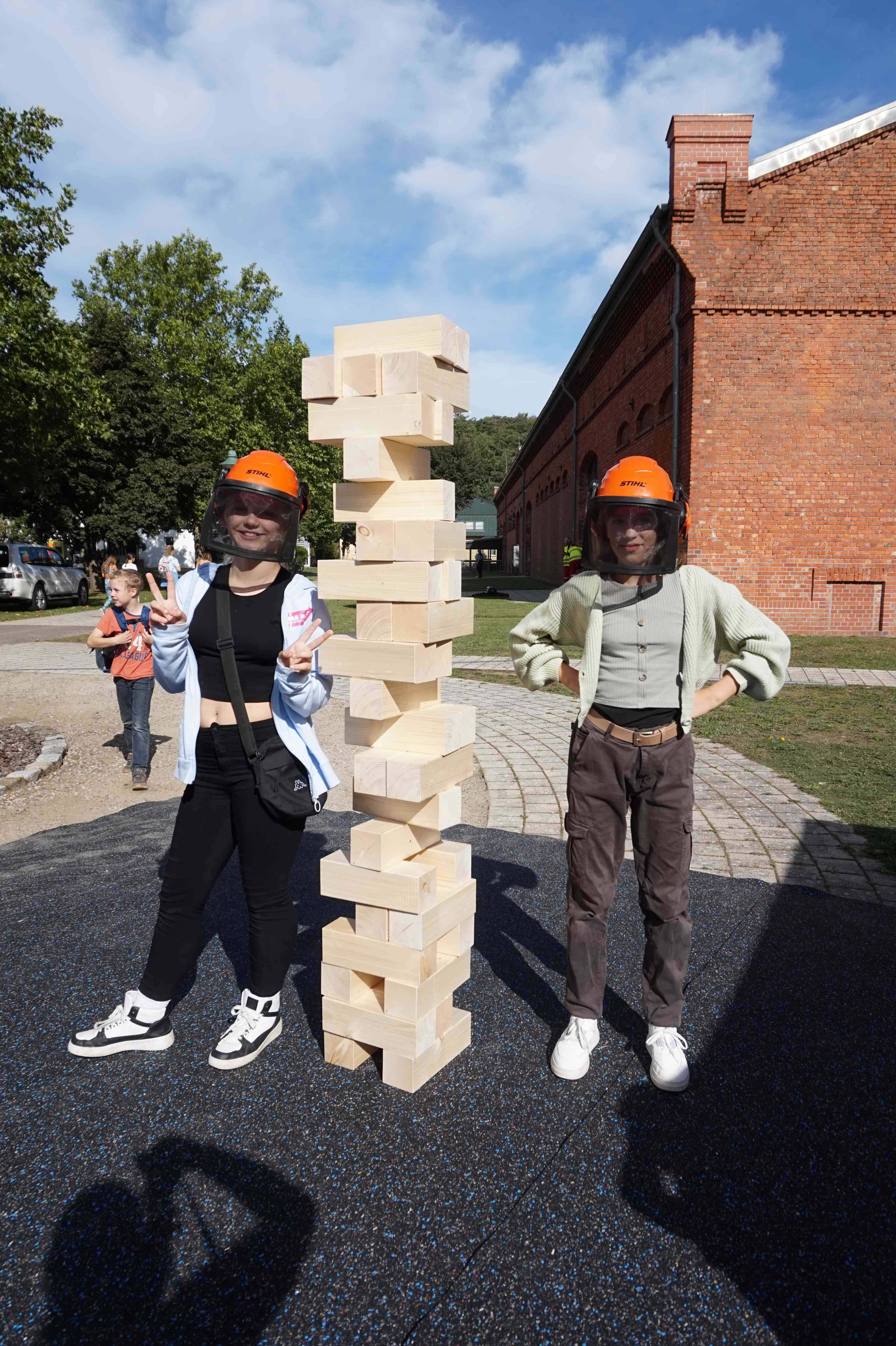 Mit lautem Geklingel und Musik traten nun hunderte Füße in die Pedale. Unter den wachsamen Augen der Polizei, der Johanniter und des THWs ging es nun quer durch die Innenstadt. Alle Autos mussten warten, denn die Straßen gehörten heute uns! Nach einer kurzen Verschnaufpause in Güldendorf fuhren wir dann zum Helene-Camp. Hier begrüßte und gratulierte uns Sven van Dyke zum Weltkindertag. Und zack verschwanden wir im Getümmel, aßen Zuckerwatte, saßen auf Motorädern der Johanniter, bauten riesige Holztürme, schauten den Lackierern bei der Airbrush über die Schulter und, und, und … Nach einem leckeren Mittagessen und der ein oder anderen Station fuhren wir dann mit einem Kopf voller Erlebnisse wieder zur Schule zurück. Das war ein echt toller Tag, danke ihr lieben Handwerker!