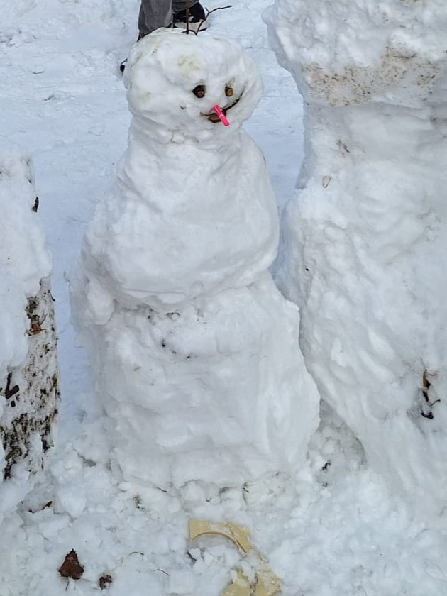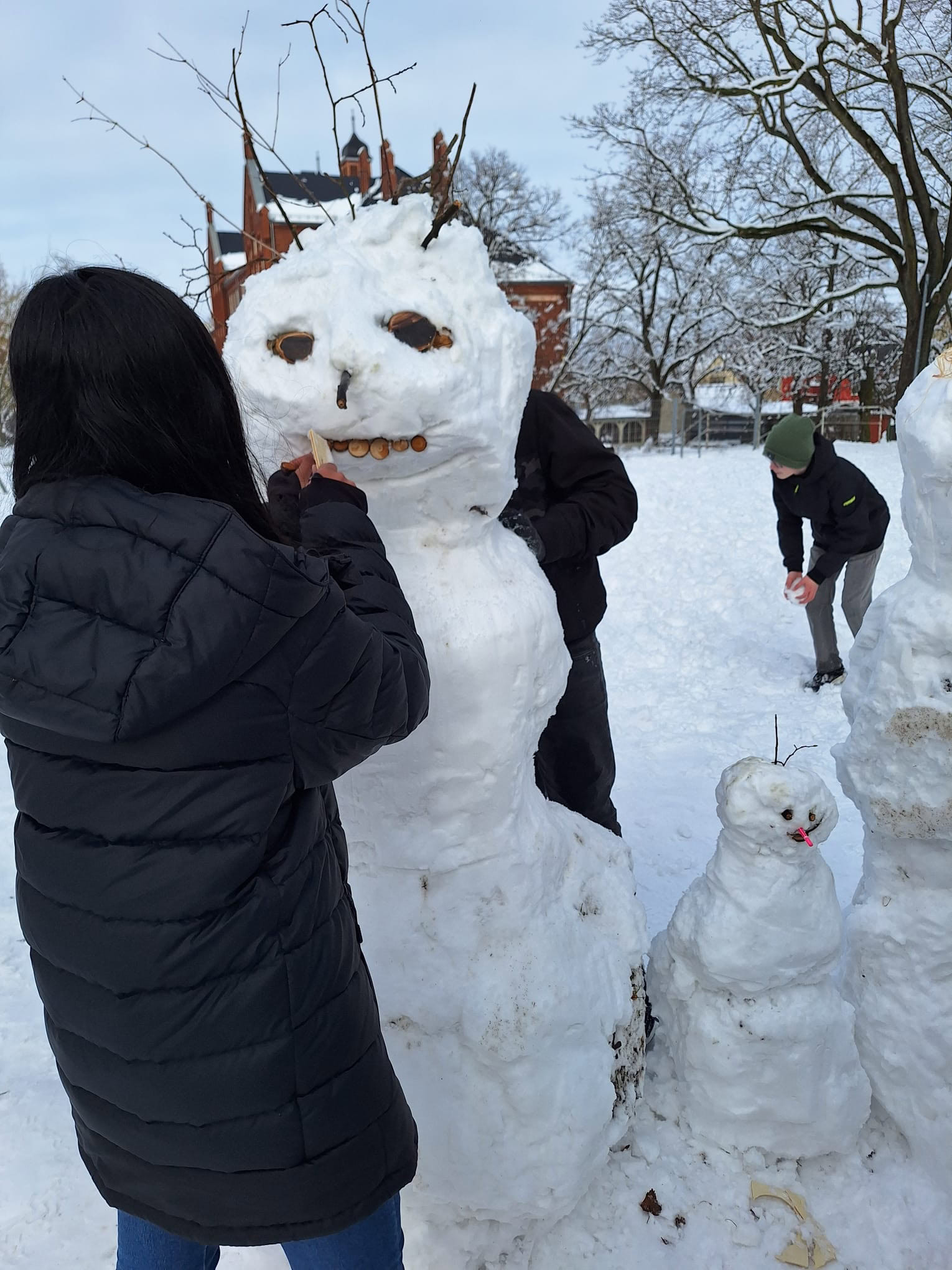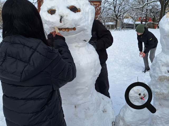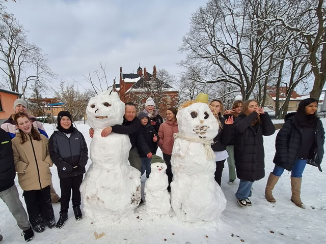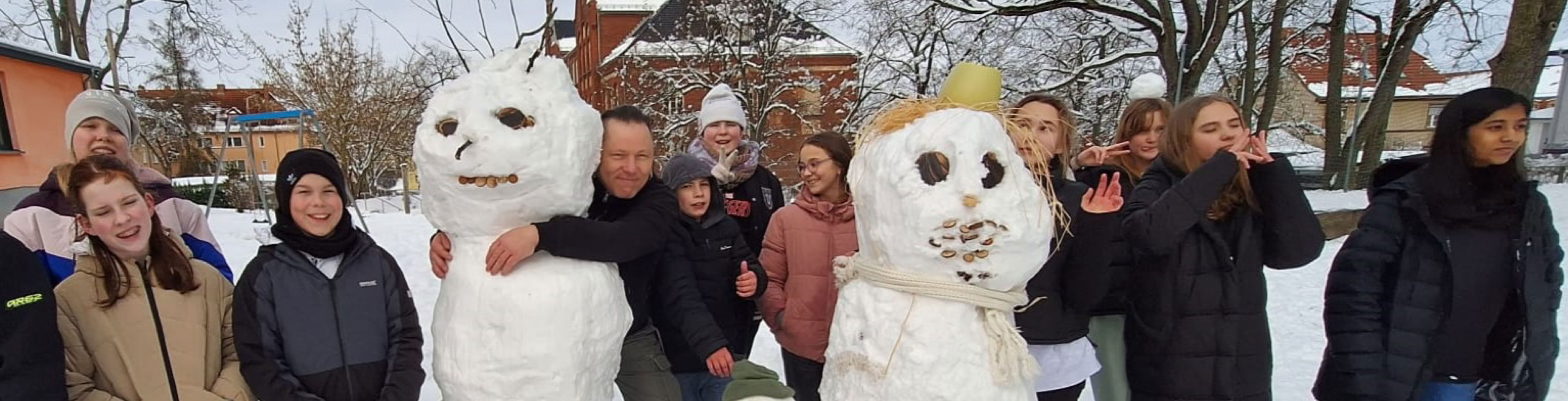 Da kann es doch nur eine Erklärung geben: Die Lehrer wollen mit uns einen großen Schneemann bauen oder nein - eine ganze Schneefamilie. Hoffentlich zeigen sie uns wie das geht, denn früher, so sagten sie, hat es öfter so geschneit. Also nutzen wir die Gelegenheit, bevor die weiße Pracht wieder verschwunden ist. Na wer sagts denn, das Ergebnis kann sich doch wirklich sehen lassen. Oder ?
