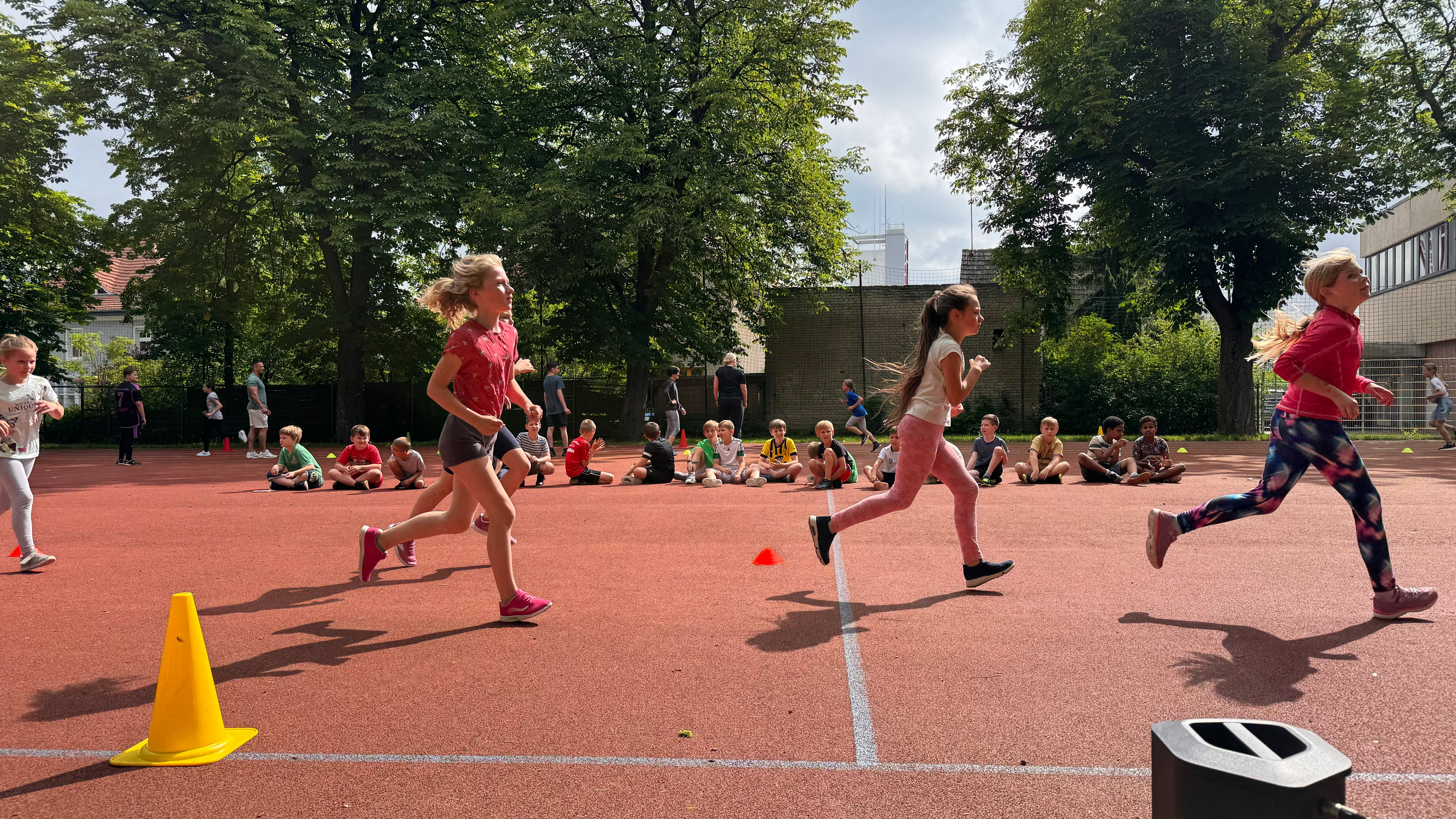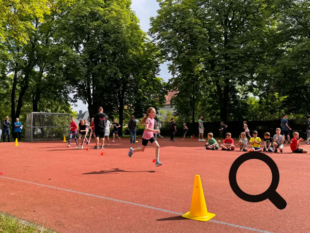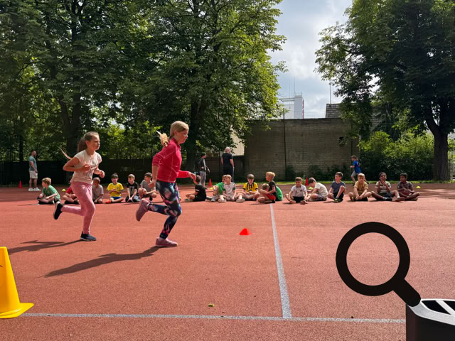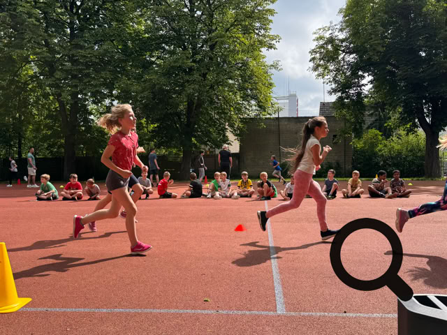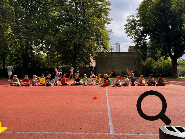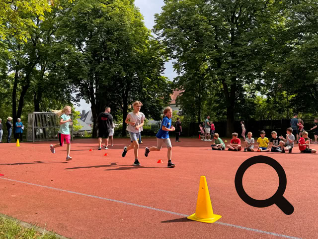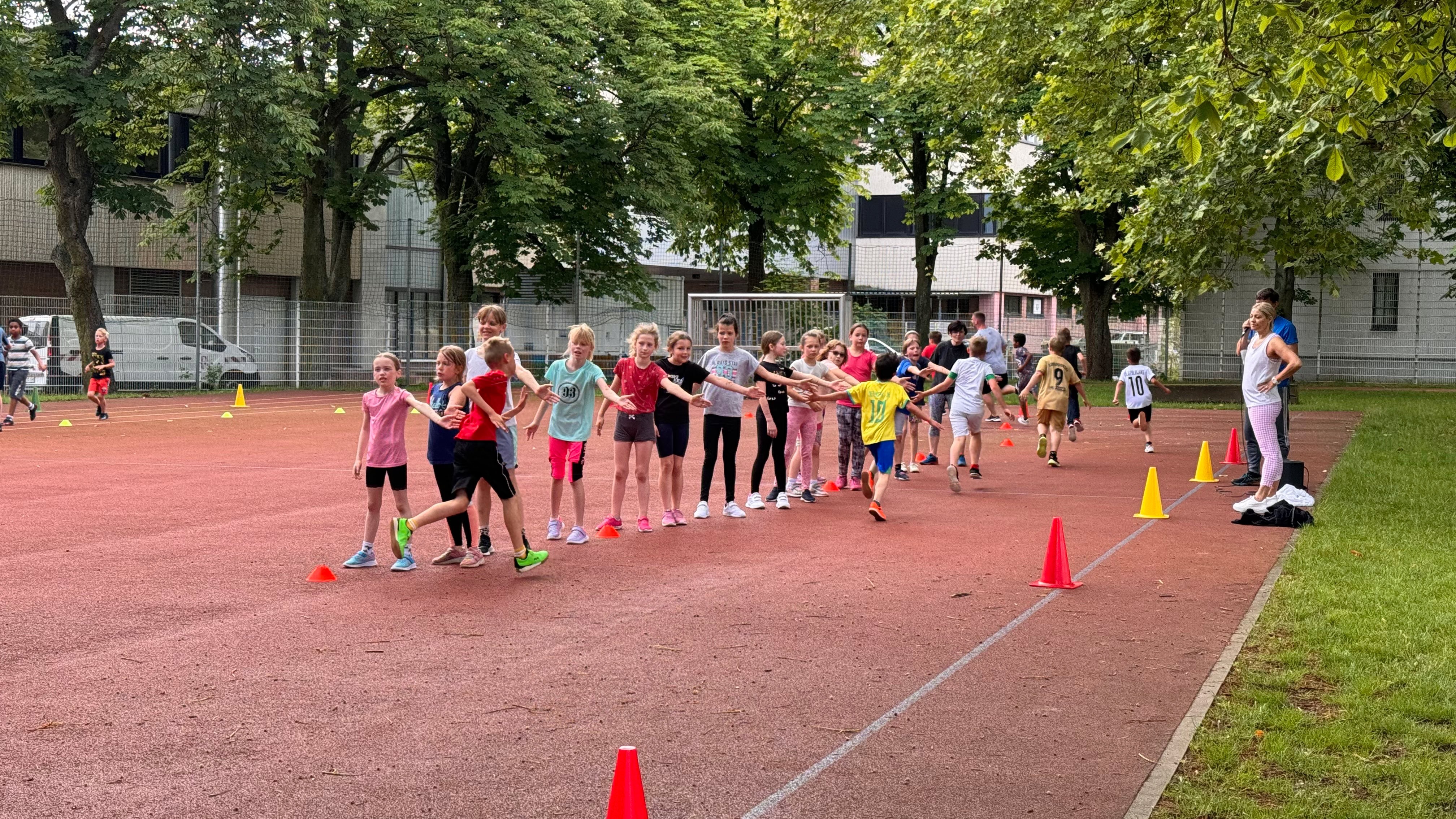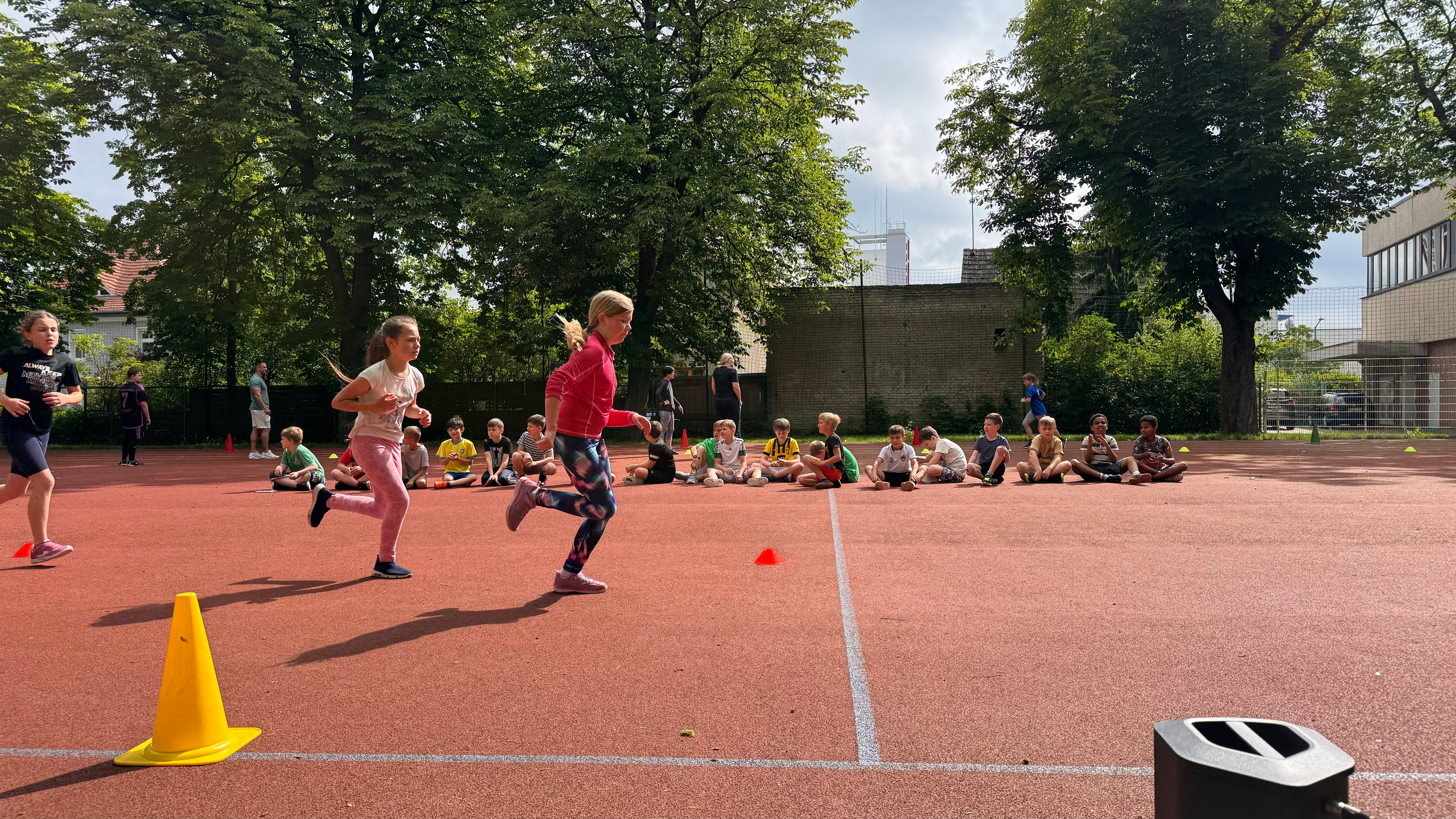 Voller Tatendrang machten sich die Schüler und Schülerinnen der 3., 4., 5. und 6. Klassen am 14.09. auf den langen Weg das deutsche Sportabzeichen zu erlangen. Endlich am Olympiastützpunkt angekommen brauchten die meisten von uns nach einer knappen Stunde Fußmarsch auch keine Erwärmung mehr. Die lange Strecke geriet beim Anblick der tollen Stationen auch gleich in Vergessenheit.                Erster Höhepunkt sollte der Staffellauf der Frankfurter Grundschulen sein.              Â