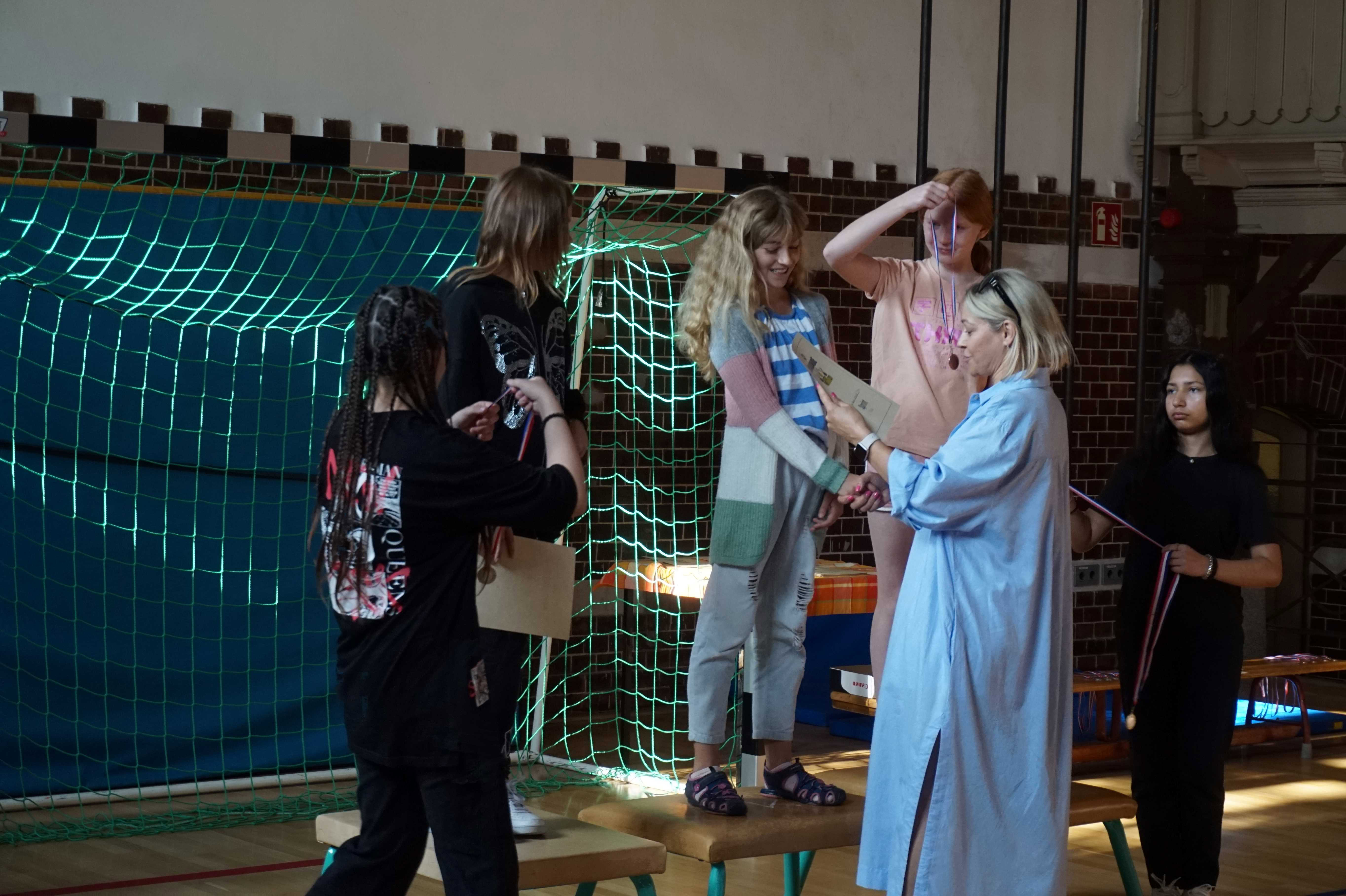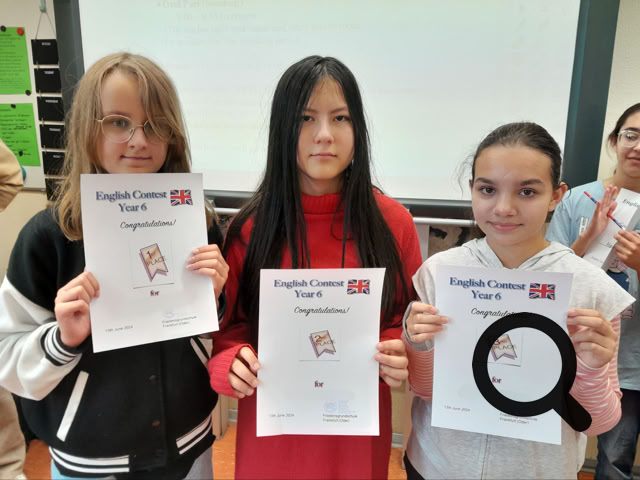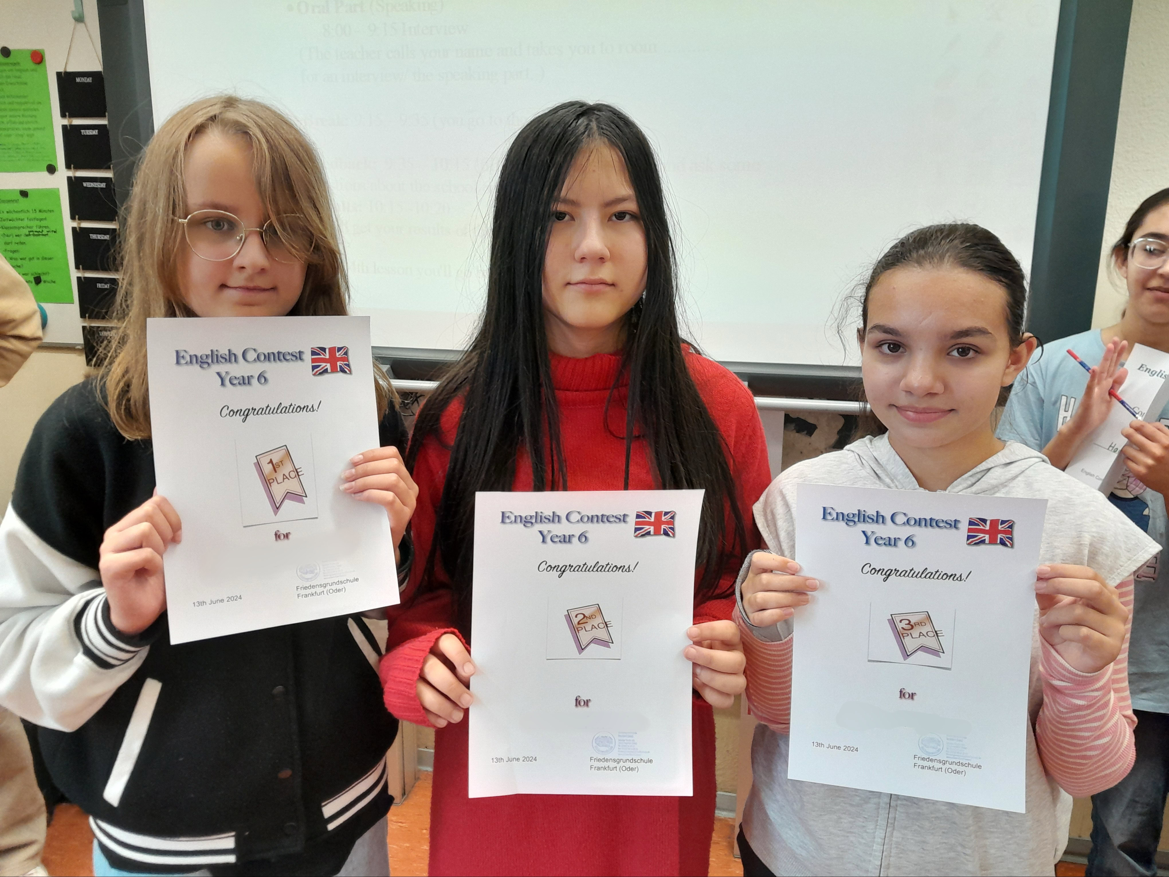 Am 13. Juni 2024 fand an unserer Schule die bereits in vielen Vor-Corona-Jahren zur Tradition gewordene Englisch-Olympiade wieder auf die alt bewährte Weise statt. Die 12 besten Englisch-Lerner der 6. Klassen durften sich in den Bereichen Speaking, Listening, Reading und Writing miteinander messen. Nach einer Höraufgabe und während ihre Köpfe über einer Lese- und Schreibaufgabe rauchten, mussten die Schüler jeweils einzeln in einem Gespräch mit Zwölftklässlern der Sportschule beweisen, wie gut ihre Wortschatz- und Sprechqualitäten im spontanen Gespräch sind. Unsere beste und damit Gewinnerin der Englisch-Olympiade an der Friedensgrundschule wurde: Miriam Degwerth! Herzlichen Glückwunsch!